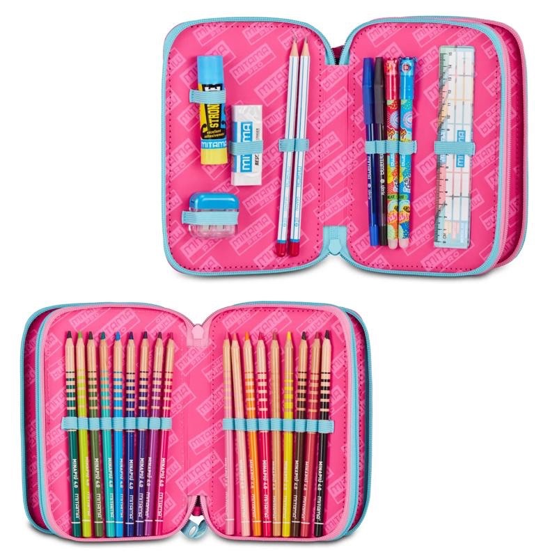 Set Completo 47 Pezzi per la Scuola L astuccio Mitama Pro include 47 pezzi: 2 penne cancellabili Spinny (blu e rosso), 2 penne Sferix fluo, 2 matite HB, gomma Reset, temperino doppio foro, 18 pastelli 4.0, 18 pennarelli superlavabili triangolari, righello, colla stick 9g ed evidenziatore doppia punta. Un kit completo per tutte le attivit scolastiche.