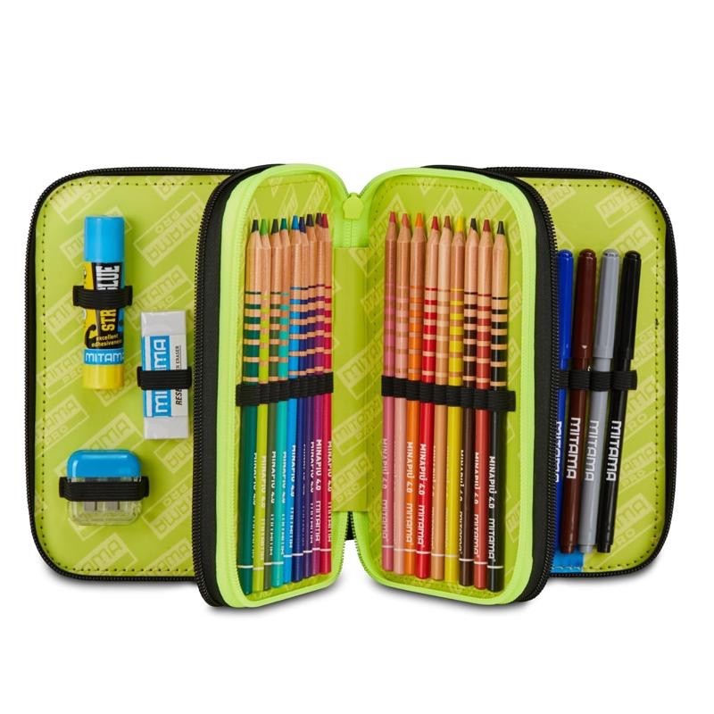 Set Completo 47 Pezzi per la Scuola L astuccio Mitama Pro include 47 pezzi: 2 penne cancellabili Spinny (blu e rosso), 2 penne Sferix fluo, 2 matite HB, gomma Reset, temperino doppio foro, 18 pastelli 4.0, 18 pennarelli superlavabili triangolari, righello, colla stick 9g ed evidenziatore doppia punta. Un kit completo per tutte le attivit scolastiche.