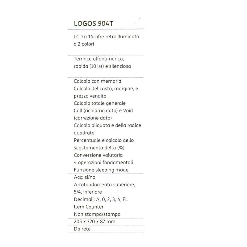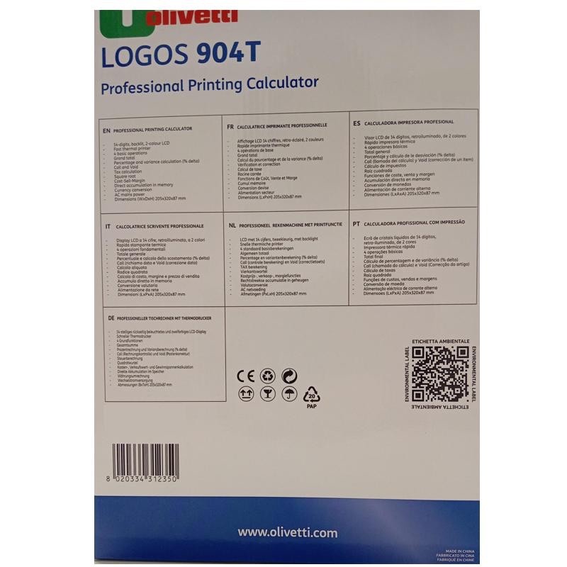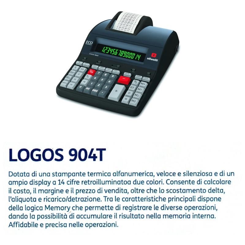 La calcolatrice scrivente professionali Olivetti Logos 904T a 14 cifre appartiene alla linea delle calcolatrici professionali Olivetti ECO FRIENDLY. Ci significa che non contiene sostanze nocive alla salute ed composta ad plastica riciclata e riciclabile pi volte.Logos 904T stata progettata per un uso intensivo ed dotata di stampante termica veloce e sileziosa. Il display LCD della calcolatrice a 14 cifre e retroilluminato a 2 colori e si spegne automaticamente dopo 3 minuti di inattivit , mantenendo i calcoli in memoria.La tastiera antisettica contro la diffusione dei batteri, muffe e microrganismi.Il design compatto ed ergonomico. La stampa rapida, a 10 linee/secondo