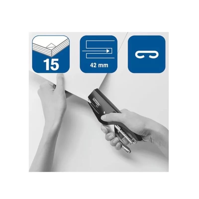 Pratica cucitrice ideale per la casa e l’ufficio.Cuce fino a 15 fogli di carta (80 gr/mq).Design ergonomica.Comoda cucitrice a pinza in acciaio verniciata a spruzzo.