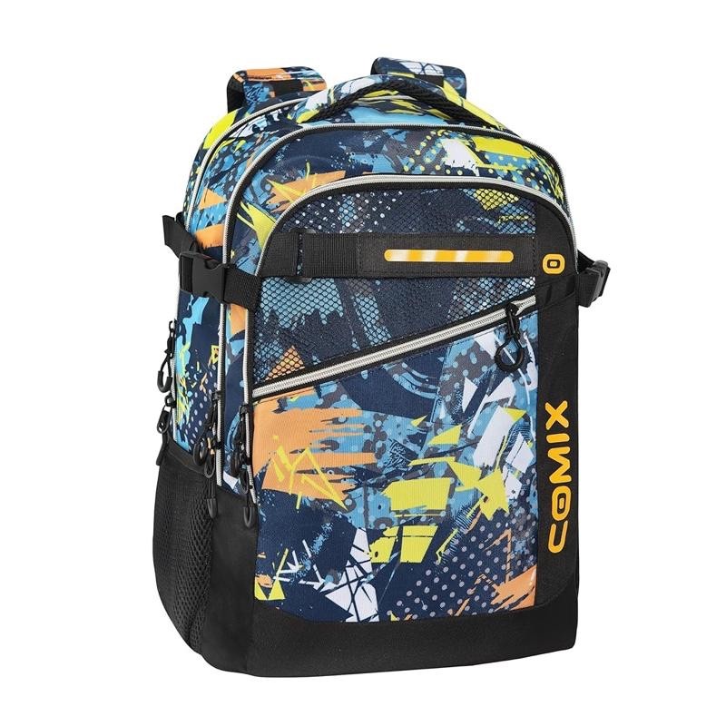 Questo zaino Comix WBS ideale per organizzare e portare con s quaderni, libri e altro materiale scolastico. Grazie al nuovo sistema WBS Weight balance System, riduce lo stress su schiena, spalle e collo. Gli spallacci ergonomici con meccanismo di ammortizzazione assorbono edistribuiscono il peso. Con un doppio scomparto, 2 tasche frontali (una sagomata e l’altra obliqua piatta) e 2 tasche laterali in rete porta borraccia con top elasticizzato, questo zaino permette di mantenere in ordine e trasportare facilmente gli articoli per la scuola. dotato di un fondo termoformato, uno schienale termoformato e imbottito, spallacci imbottiti e regolabili, maniglia imbottita e pratiche chiusure a zip, per un comfort e una resistenza elevati.