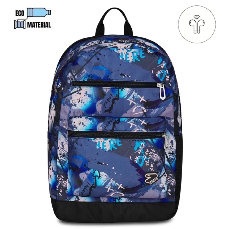 Zaino Reversibile con earphones wireless abbinati e markers per personalizzare lo zaino. Un lato stampa allover, un lato tinta unita