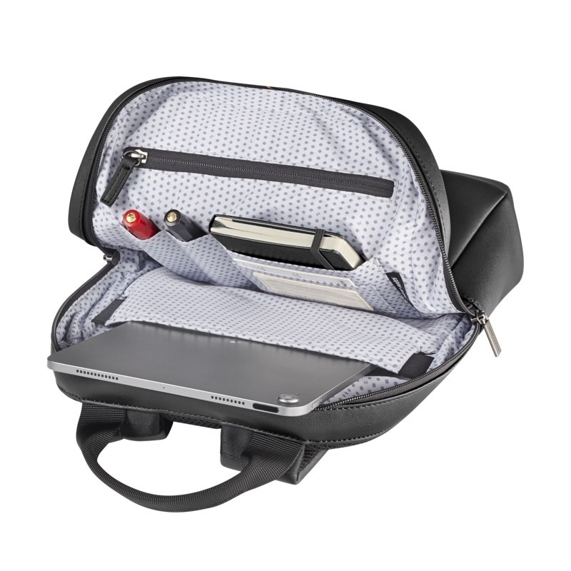 - 1 tasca sicura con zip e 1 organizer con portapenne, tasca imbottita per occhiali e porta biglietti da visita